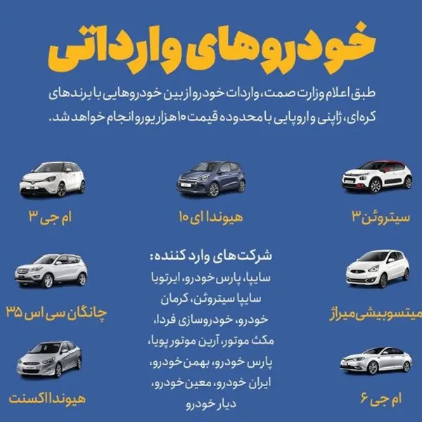 تیر ۱۴۰۳: علی بهادری جهرمی، سخنگوی دولت، از تصویب آییننامه واردات خودروی مدل ۲۰۱۹ به بالا برای همه ایرانیان خبر داد.